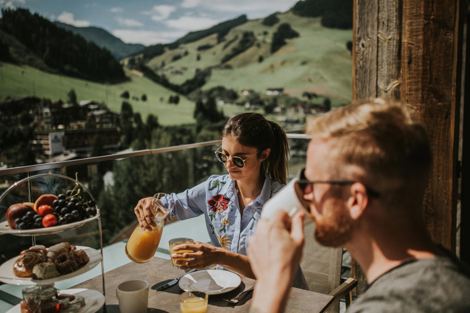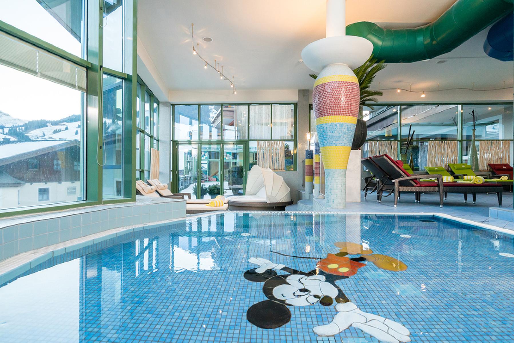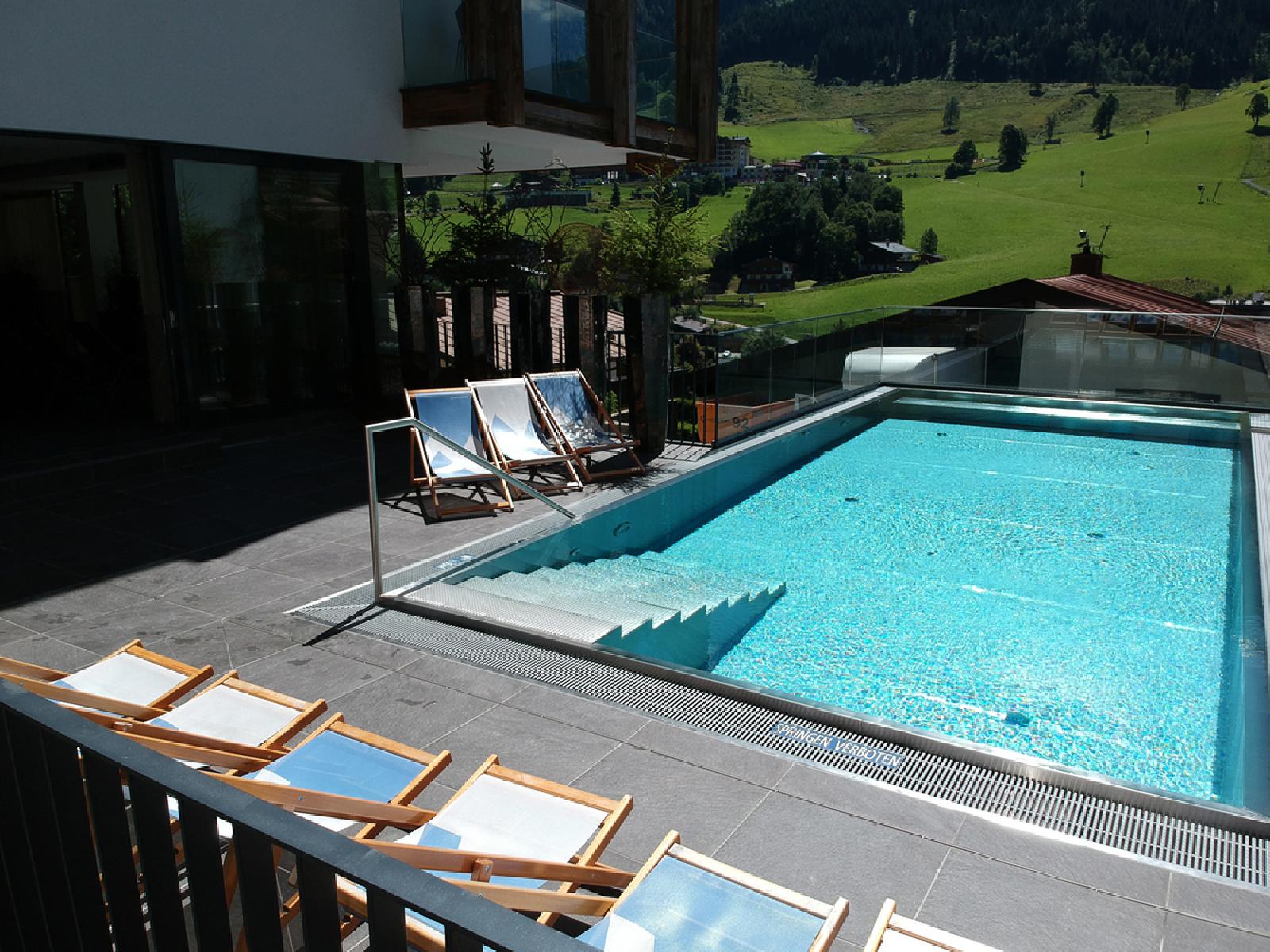 Freiheit erleben im Adler Resort: Nach einem aktiven Tag in den Bergen lädt der großzügige Wellnessbereich zum Abschalten ein – mit einem beheizten Pool und dem wohl schönsten Panoramablick ins Tal.