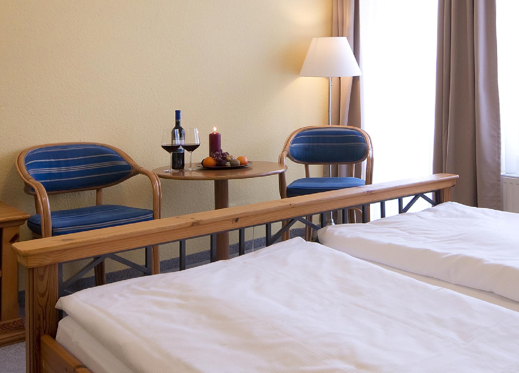 Die komfortablen und hellen Zimmer im Landhausstil verfügen über SAT-TV, Naturholzmöbel, teilweise Parkettfußboden und Dusche oder Badewanne/WC und haben teilweise einen Balkon und bieten zum Teil eine ruhige Park- und Waldlage. Die Zimmer bestehen aus einem Schlafraum mit einem Doppelbett. Die durchschnittliche Zimmergröße beträgt circa. 21 -27 m².