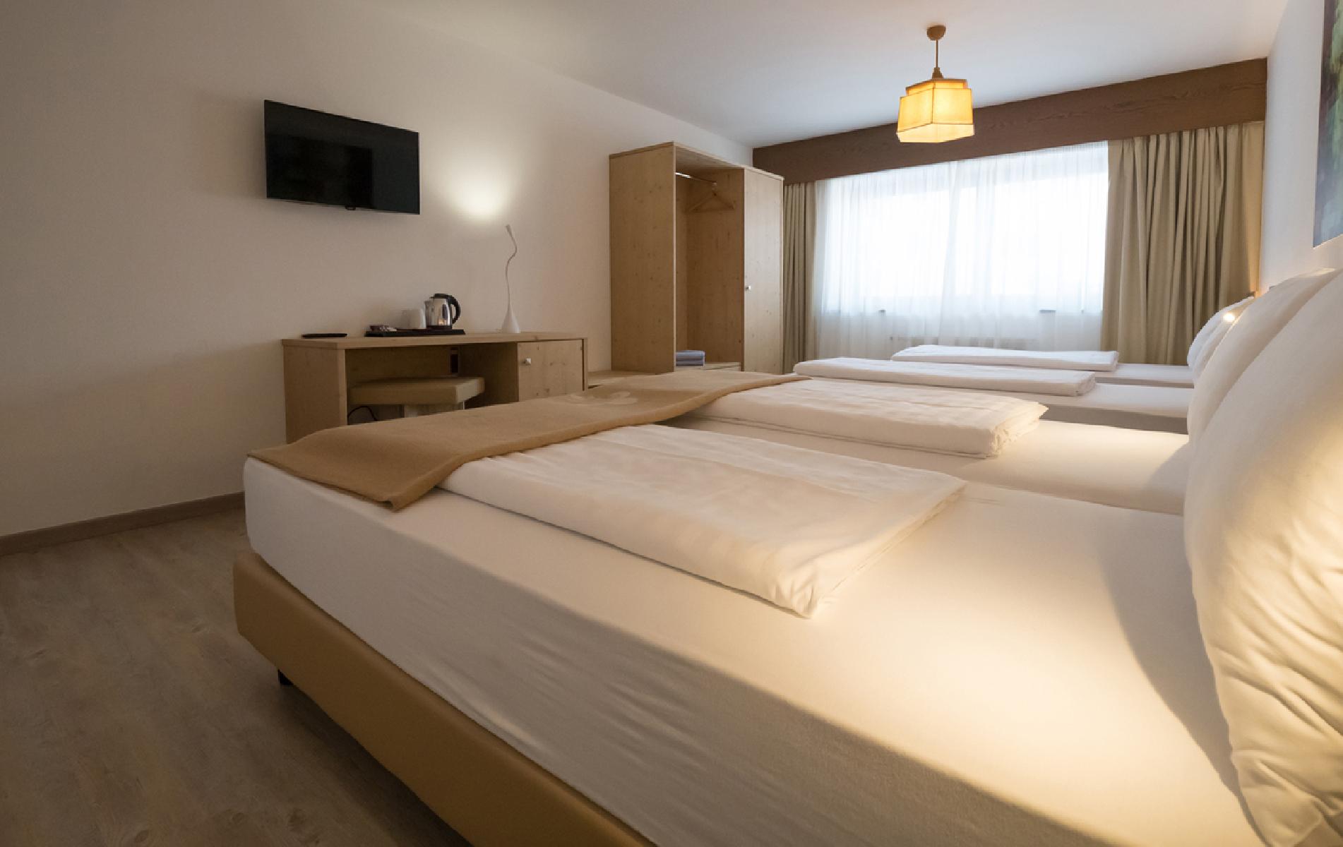 Die komfortablen und gemütlichen Zimmer verfügen über TV, Telefon, Dusche oder Badewanne, WC, Haartrockner und Pflegeset und haben teilweise einen Balkon. Die Zimmer bestehen aus zwei Schlafräumen mit einem Doppelbett bzw. 2 fixen Einzelbetten sowie einem Wohnschlafraum mit einem Einzelschlafsofa. Belegung: Min.: 2 Erwachsene und 2 Kinder. Max.: 5 Erwachsene. Die durchschnittliche Zimmergröße beträgt ca. 50 m².