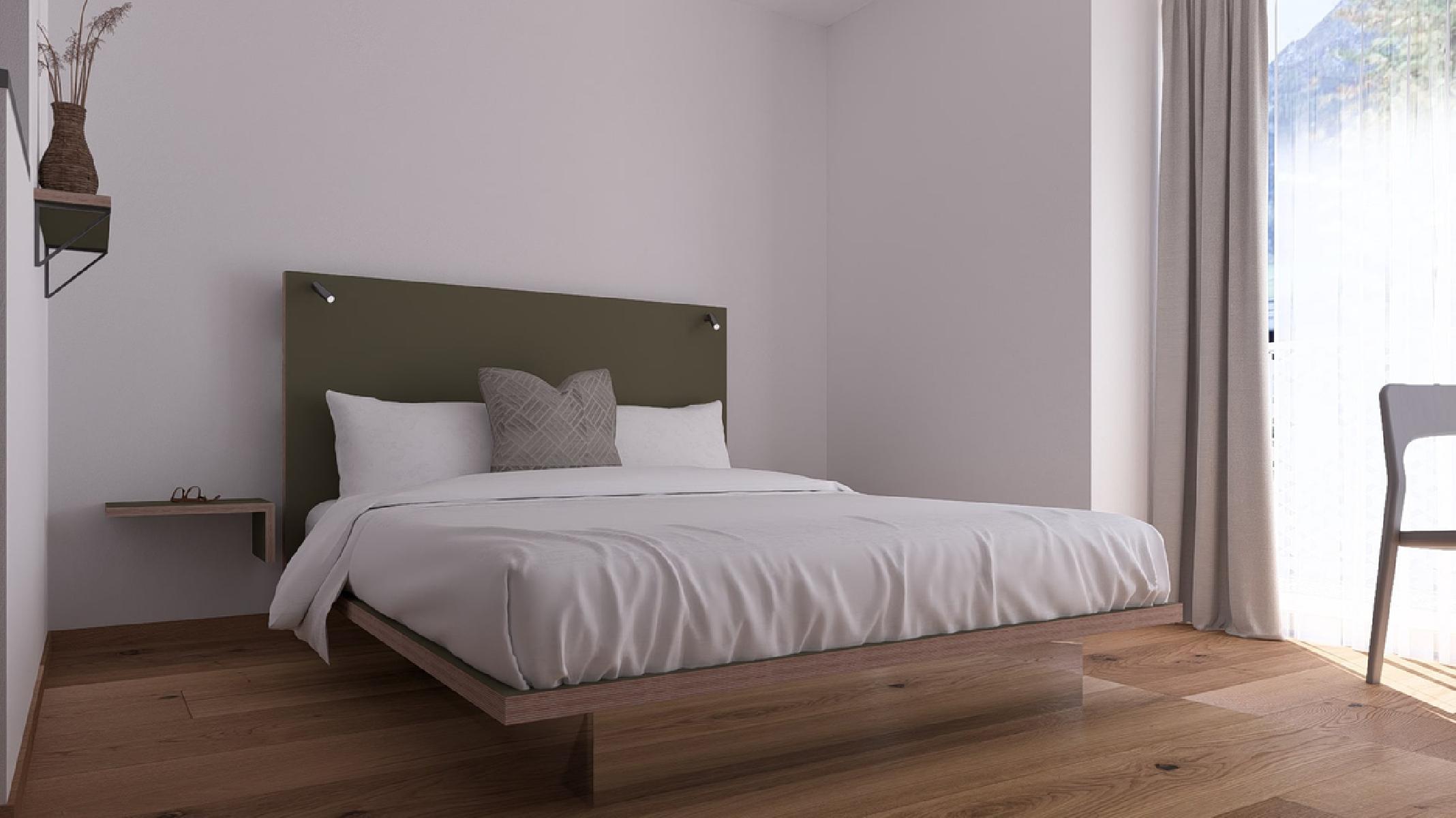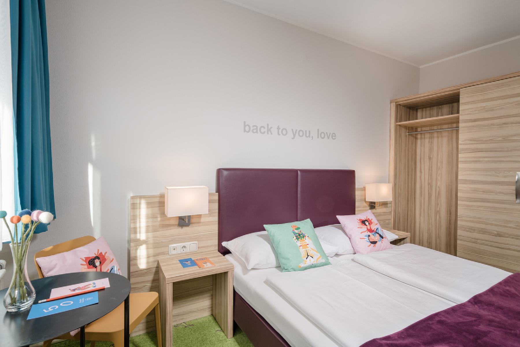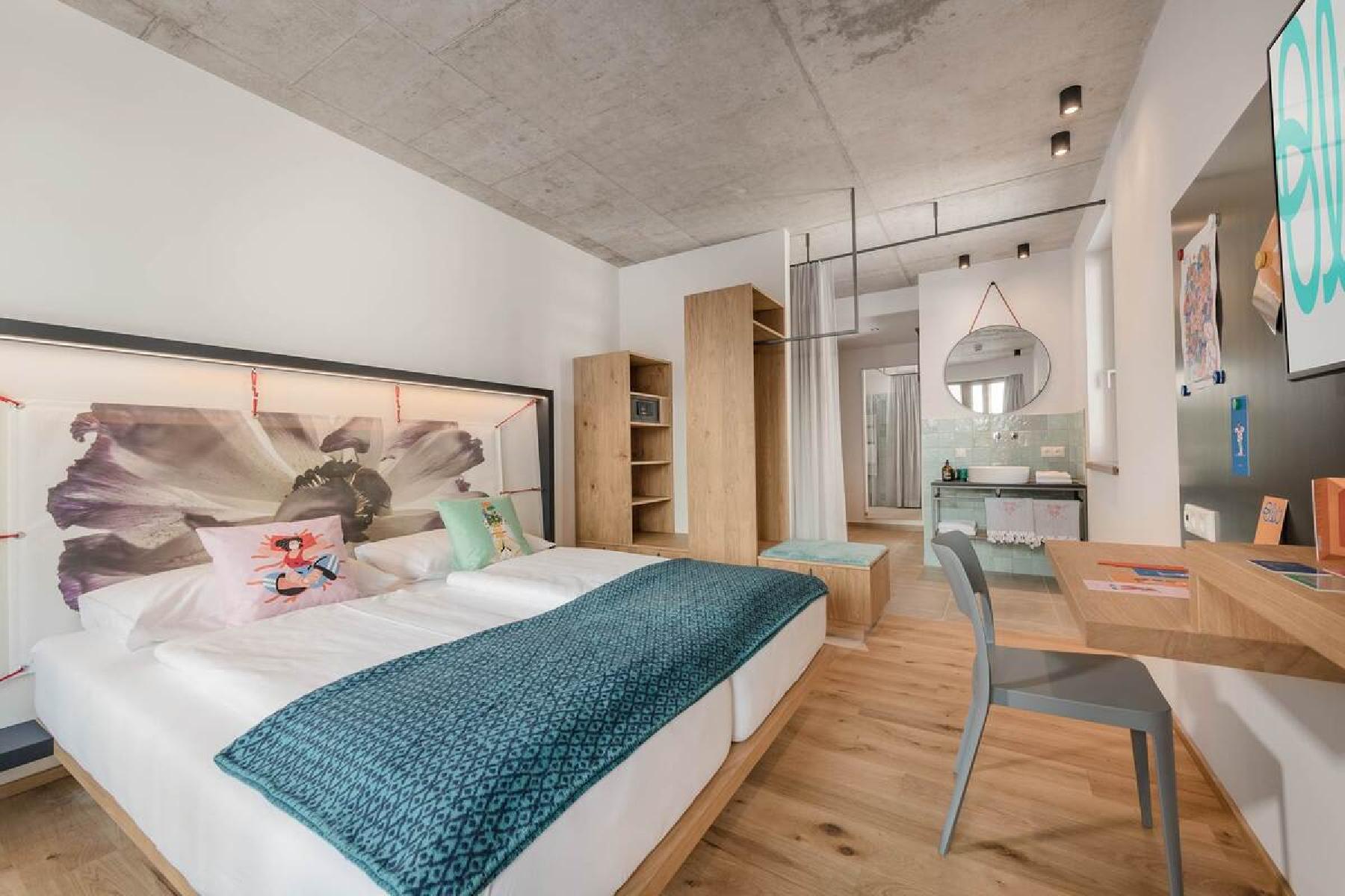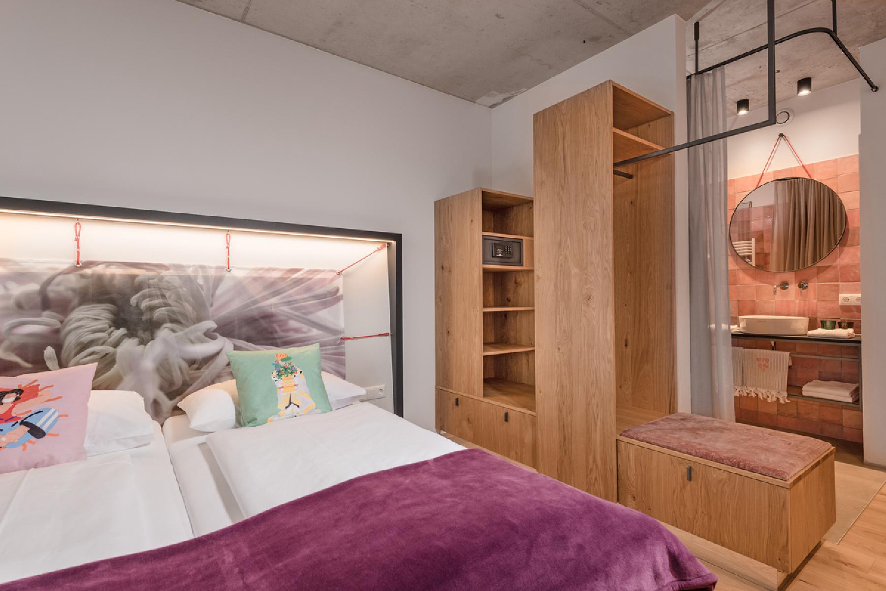 MOOD im Stammhaus (2025 renoviert): Die gemütlichen, hellen Doppelzimmer bieten einen Schlafraum mit ca. 16 m² und Flatscreen-TV, Safe, Föhn, Dusche, WC und Balkon. Im Zimmer befindet sich ein Doppelbett.