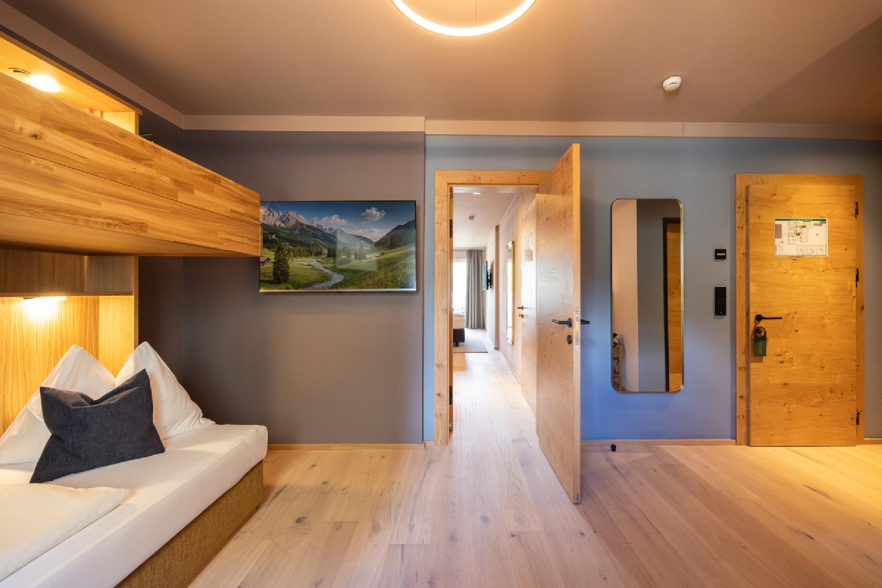 Die komfortablen Nichtraucherzimmer verfügen über Flat-Screen-Fernseher mit Kabel-TV, Telefon, Radio, Dusche, WC, Haartrockner und Kosmetikspiegel. Die Zimmer bestehen aus 2 Schlafräumen mit Verbindungstüre und haben einen Balkon. Im ersten Schlafraum steht ein Doppelbett zur Verfügung und im zweiten Schlafraum steht ein Sofa mit Etagenbett zur Verfügung. Die durchschnittliche Zimmergröße beträgt ca. 43 m².