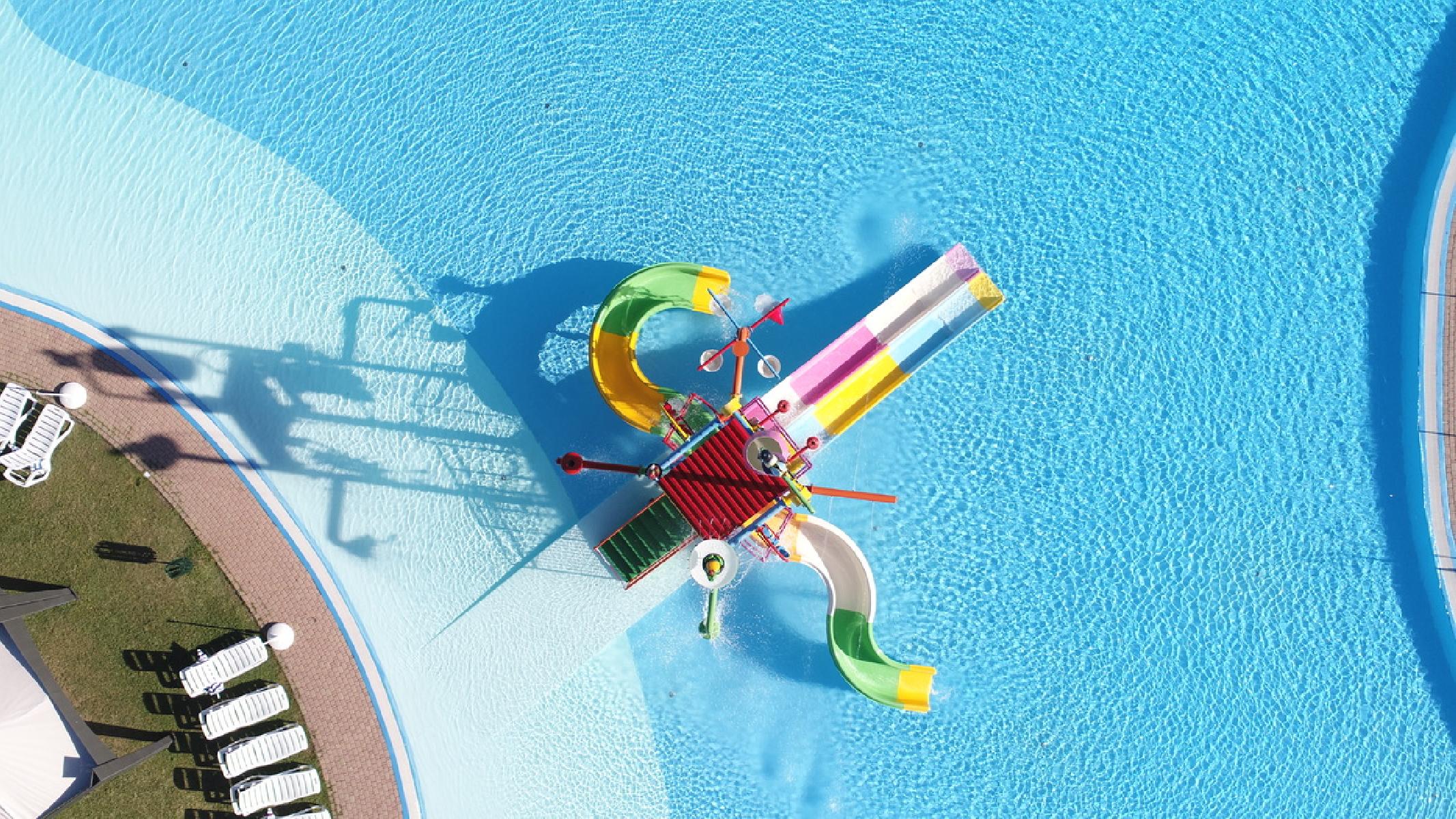 - Außenpool (ca. 1700 m²) mit Rutschen und Wasserpark, umgeben von Sonnenschirmen und Liegen